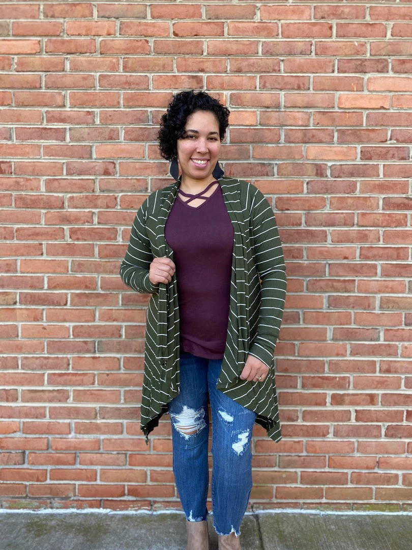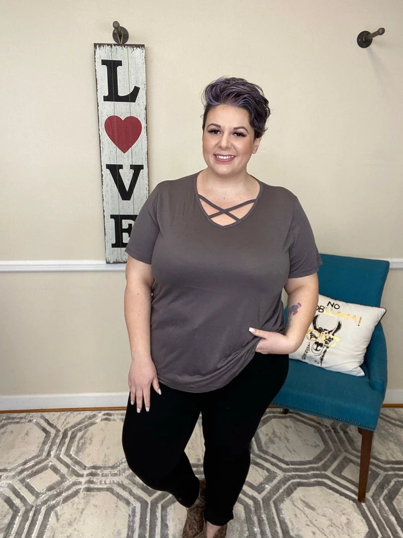 A basic top that’s perfect for layering or wearing as is! With this tee, you can style it under jackets, cardigans or wear it by itself. The criss-cross detailing on the chest takes this basic tee up a notch and gives it a sassy flair. Pair this with your favorite pair of jeans, leggings, shorts or skirt for a comfortable top that you will never want to take off!
