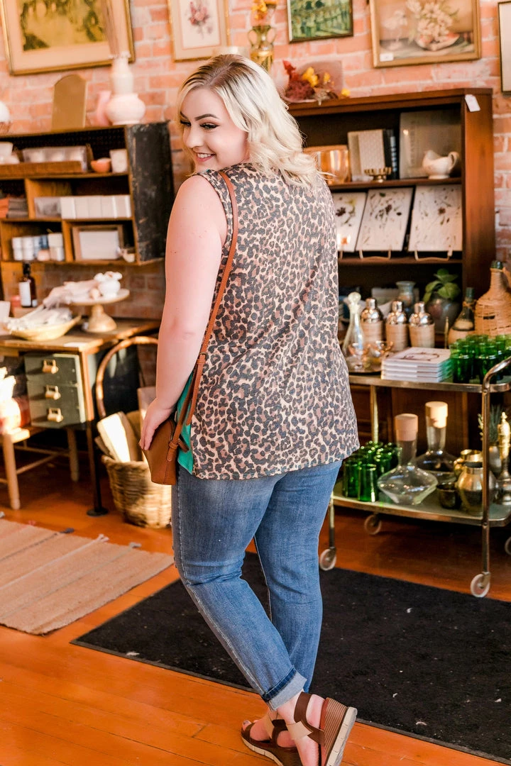 - Leopard print back and trim on neck and armholes