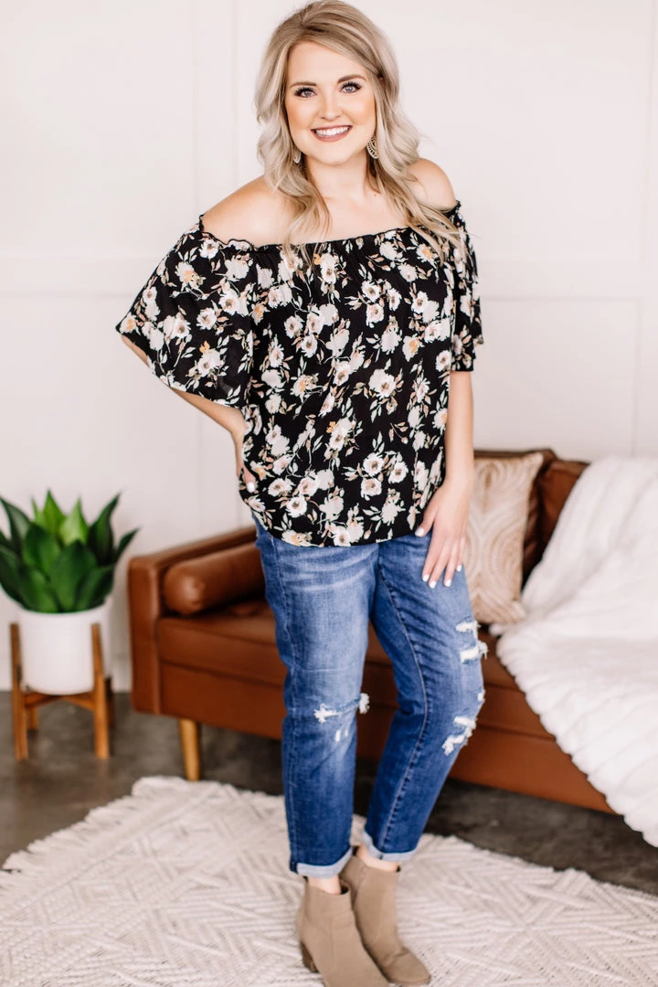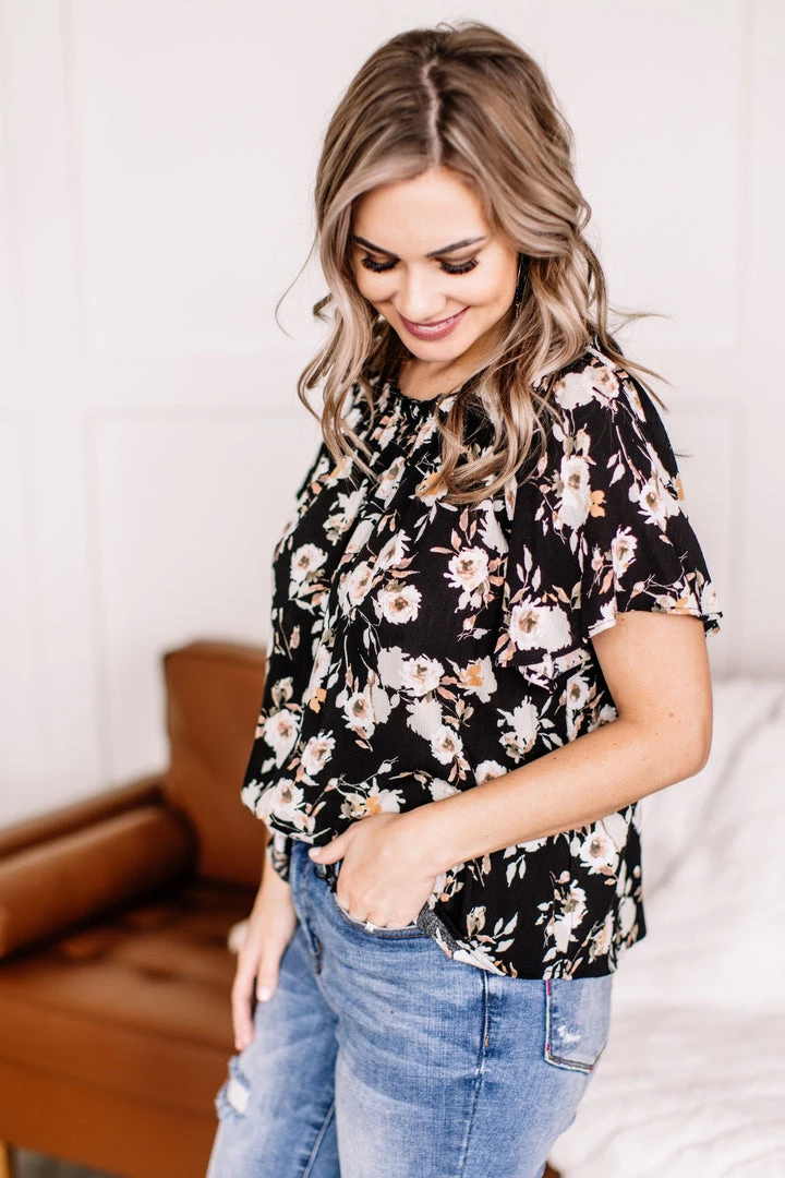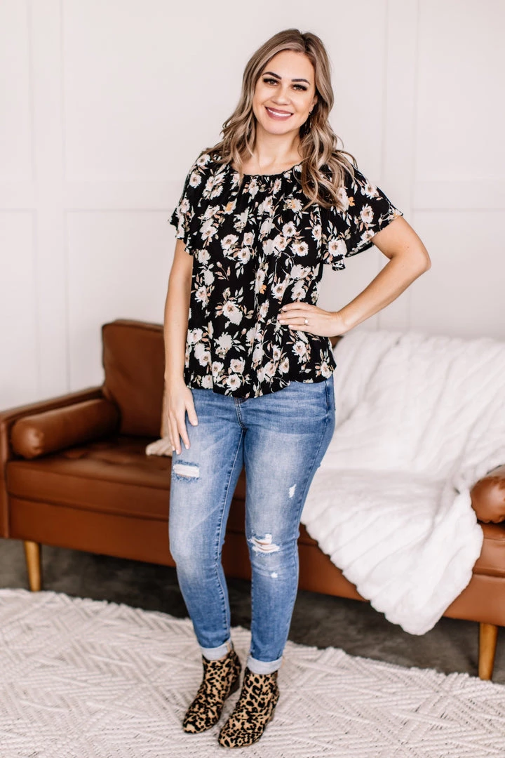 The perfect fall colors, raglan style blouse, and that fabulous floral pattern. Could there be anything sweeter, you may ask? Well, we are glad you did; theΒ ability to wear this off the shoulder and those soft, flutter sleeves make this a timeless piece.Β