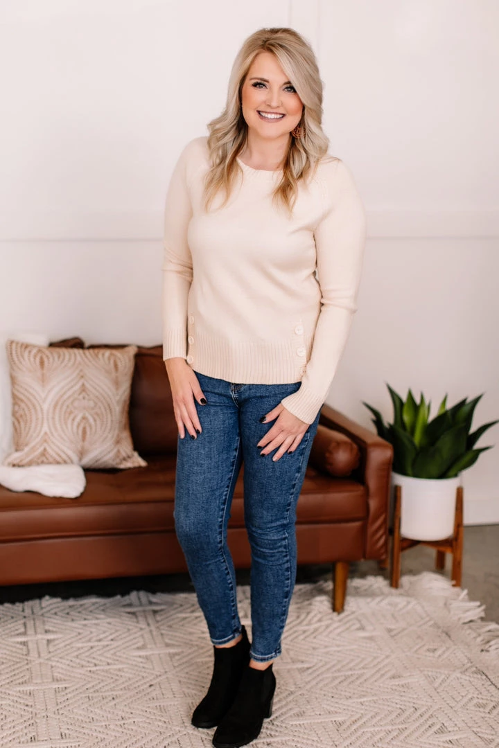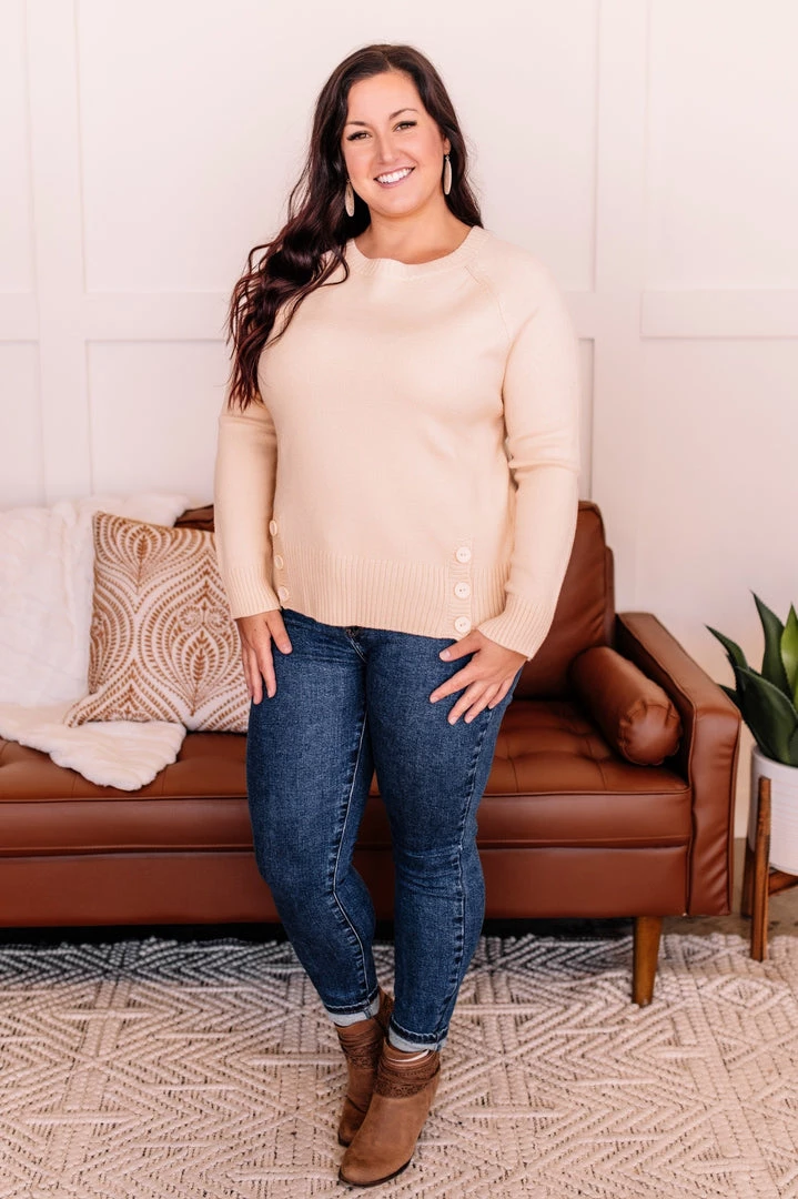 - Decorative button detail on lower front
